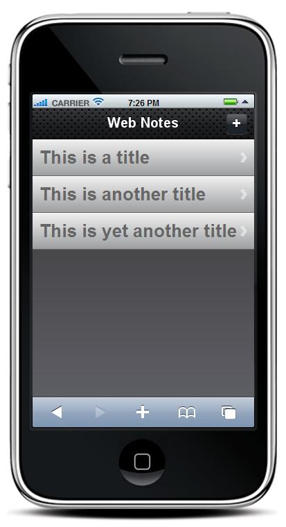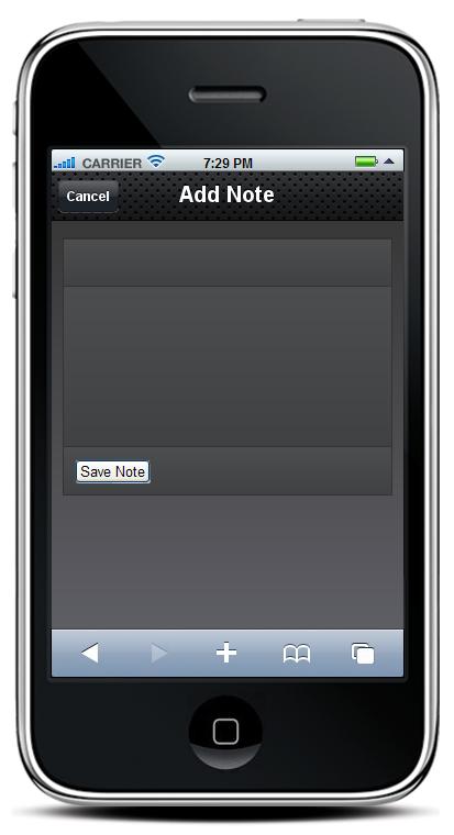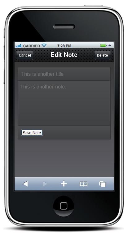 If successful, we clear out the values in the input elements (ready for the next add), refresh the list of notes so the new one will show up and use a jQTouch function, jQT.goBack() to return to the “home” screen. Since we used “slideup” to show the “addNote” screen, jQTouch is smart enough to slide it down to return to “home”. We then return “false” to the browser, as we don't need it to continue.