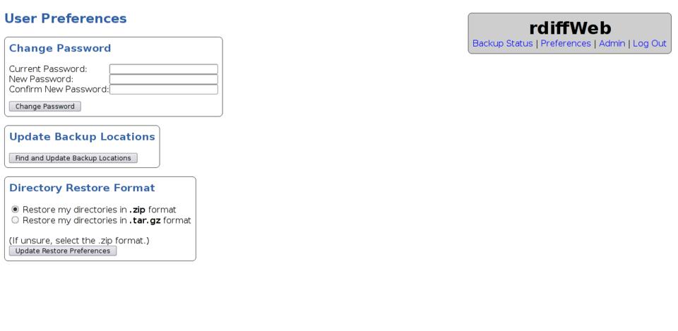 When you first access rdiffWeb, you will be prompted to set up an administrator account. Once that is done, you then can set up users and work with User Preferences (Figure 4). Of note is the Directory Restore Format option. This comes into play if you are going to restore an entire directory. rdiffWeb either will create a zip file or gzipped tarball, depending on the setting, which is good for dealing with Windows or UNIX users. Also worth noting is the Update Backup Locations button. This is a way of forcing rdiffWeb to find any new backup directories you have added. It will find them on its own, but generally not immediately.