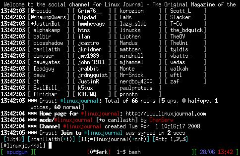 Irssi is a very popular IRC client for the console. Features include logging, custom formatting and themes, configurable key bindings and many, many others. Irssi provides a powerful Perl scripting interface, with many contributed scripts available from Irssi.org. Irssi uses a windowing interface that allows for dozens of server connections, channels and messaging windows to be open and accessible at once.