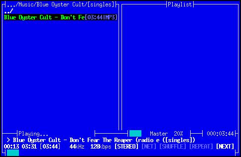 MOC (Music on Console) is a CLI music player that will have a familiar interface to users of Midnight Commander. MOC supports, among others, Ogg Vorbis, MP3 and FLAC. It outputs to ALSA, OSS or JACK and can create and load M3U playlists. MOC utilizes a client/server architecture that allows the user to detach MOC from its graphical interface to reclaim its controlling terminal for other uses, while leaving the playlist still running in the background.