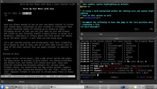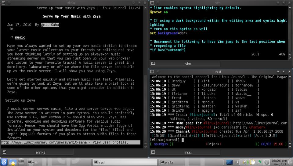 Supporting AIM, ICQ, Lily and IRC, naim is an elegantly designed alternative to Finch if you don't need all of libpurple's protocols. naim uses a very simple command-driven interface. All text entered with a preceding / is considered a command, and all other text is sent as a message to the current active window. naim supports simultaneous connections to multiple networks and IRC servers, with each “window” displayed in a slide-out list that can be called up with the Tab key.
