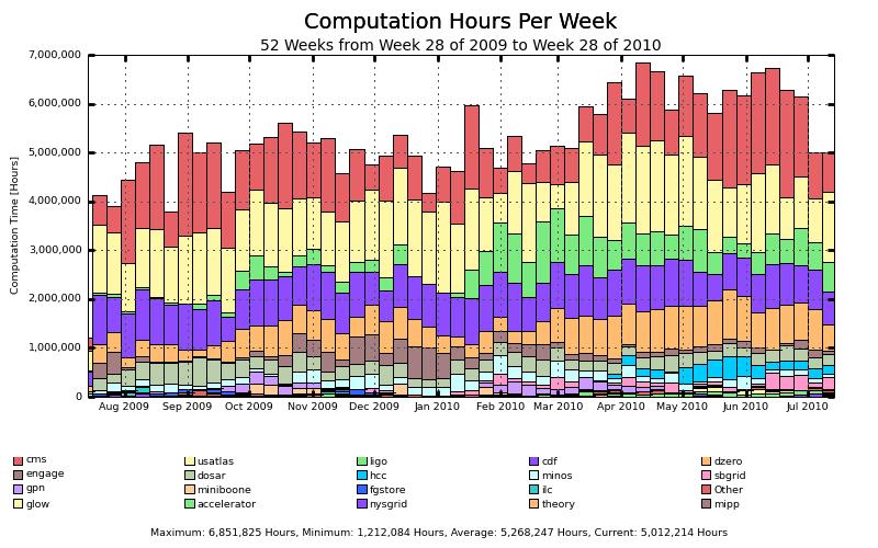 Figure 1. A week-by-week accounting of Open Science Grid usage by user VO for the past year.