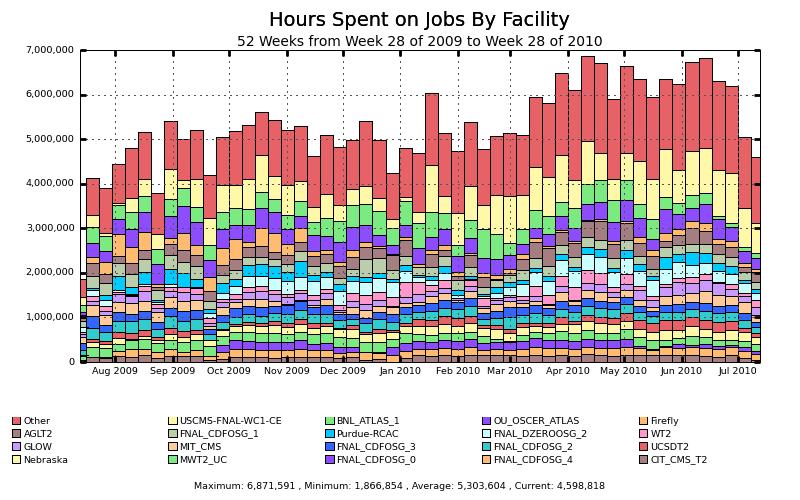 Figure 2. A week-by-week view of CPU hours provided to the Open Science Grid by computing facilities. Both “Nebraska” and “Firefly” are resources provided by the the University of Nebraska.