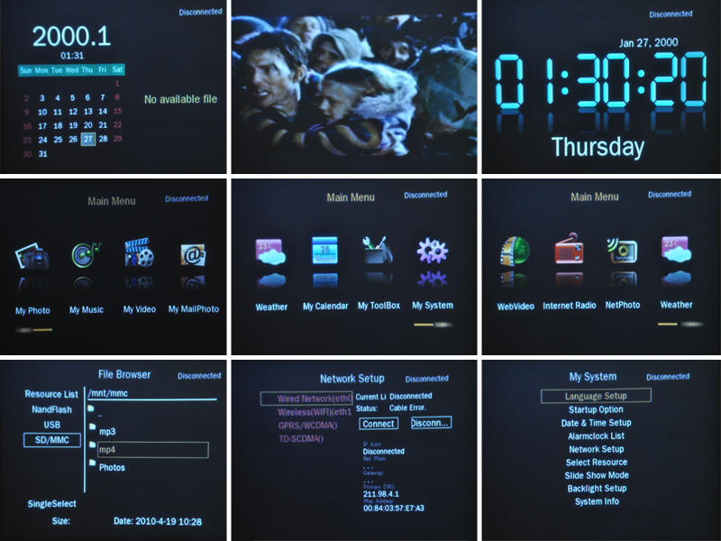 The wireless network can be configured from a settings page, and although the interface was simple, it did work fine and detect and connect to my wireless network. When you get to that menu, you'll get excited like I did when you notice that it lists not only wireless but also wired, GPRS/WCDMA and TD-SDCMA configuration; however, none of those are actual valid options, which makes me wonder why they were added to that menu.