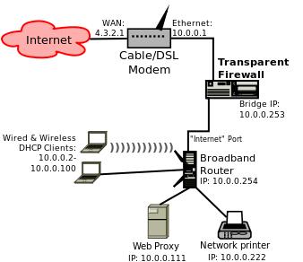 That's it! Things downstream of the firewall—that is, transactions between hosts connected to the broadband router shown in Figure 1—don't need to be allowed by the firewall. For example, print jobs sent from wired and wireless DHCP clients to the network printer don't need an “allow LPR” rule, because those packets should never reach the transparent firewall in the first place.
