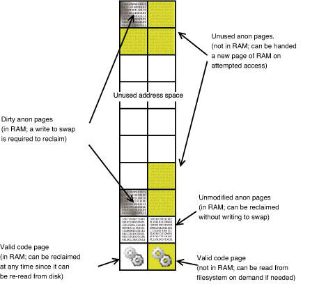 Program data and stack space are a different story. These are placed in anonymous pages, so named because they have no named filesystem source. Once modified, an anonymous page must remain in RAM for the duration of the program unless there is secondary storage to write it to. The secondary storage used for these modified anonymous pages is what we call swap space. Figure 1 shows a typical process' address space.