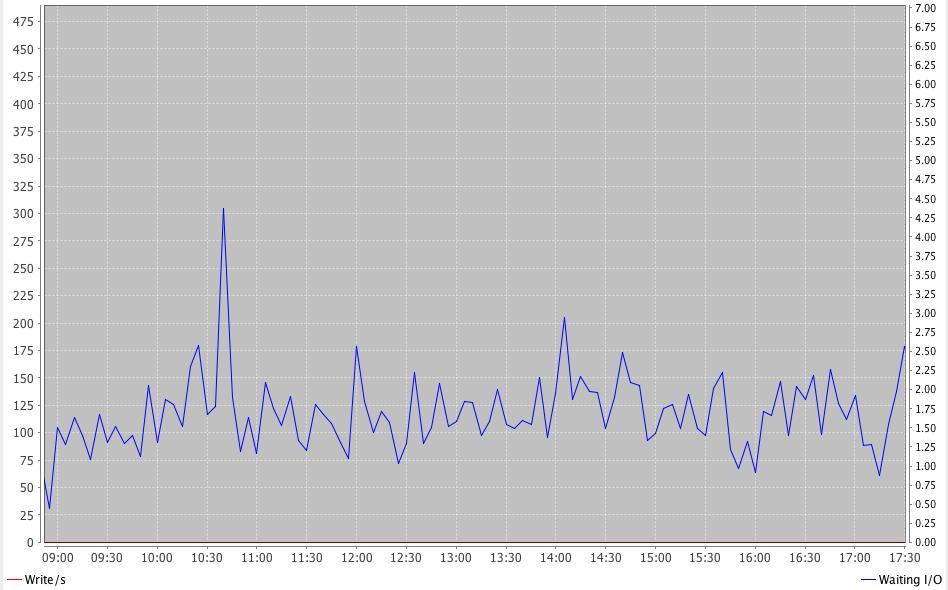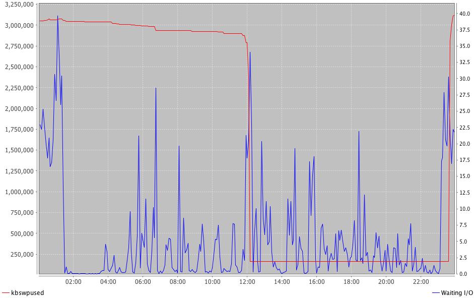Figure 3 shows a graph comparing writes to the swap device vs. I/O wait (over a daytime time interval). It is a bit hard to see, but the red line for I/O is actually zero across the whole of the time span. This indicates that the I/O wait had nothing to do with swapping. Note that this does not mean no swapping of any sort occurred. Non-anonymous pages could have been reclaimed and reloaded.