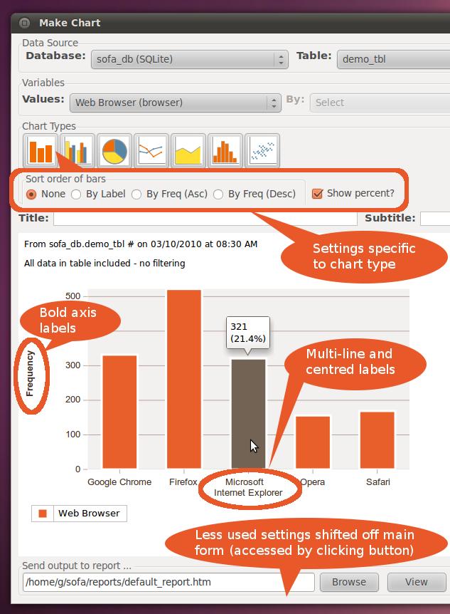 However, one of the most impressive and practical features under all three of these main sections is the Send output to... feature, with its View button. Here you actually can view each page of output in any Web browser in HTML format. This gives the project some instant credibility and practicality in that any work you do in SOFA can be opened instantly by anyone (like your coworkers) on their own computers, without needing to install SOFA Statistics. Plus, the information they see will be presented professionally with some impressive graphics to boot.
