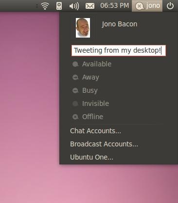One of the key enhancements that Ubuntu 10.04 Lucid Lynx brought was the ability to tweet directly from your desktop without even needing to access the Gwibber window. With your broadcast accounts all set up, you can tweet by clicking your user name (you also can press Super-S) on the panel and typing your tweet into the text entry box in the menu (Figure 4). This makes tweeting from Ubuntu a snap; one click, and your thoughts are broadcast instantly!