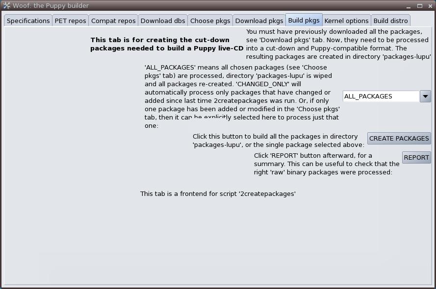 The Build pkgs tab executes the script (2createpackages) that takes the distro packages you downloaded (Ubuntu .deb packages in this example) and converts them to PET packages. At the end of this step, you have a complete collection of PET packages for your distribution.
