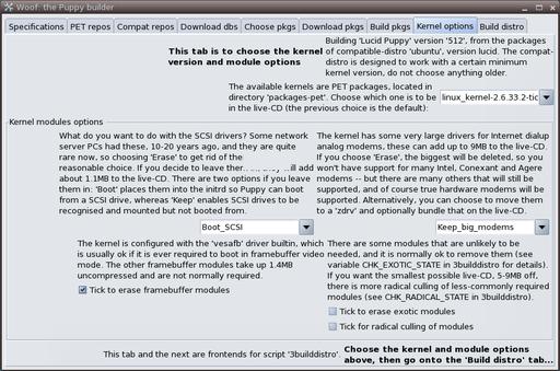 Kernel options offers you a choice of Linux kernels and some options for paring down the kernel size. Depending on your concern about kernel size, your need for the specific modules mentioned and your willingness to experiment, you can choose whether to include them.