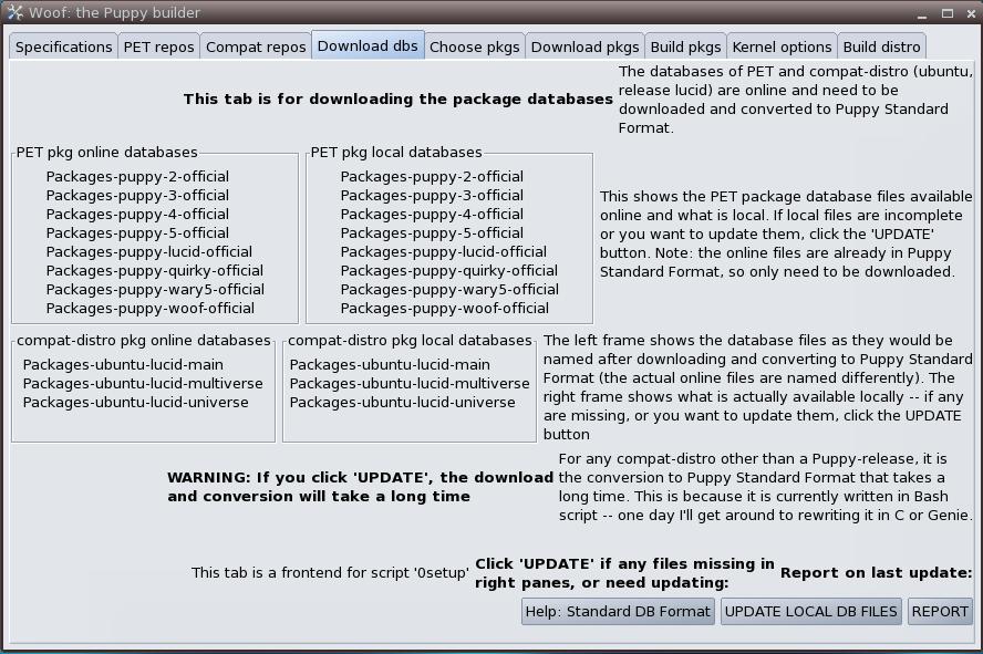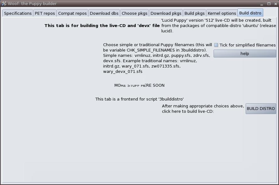 The tabs at the top of this utility correspond to the steps in building a distribution. The tabs mirror the Woof configuration files and allow you to customize your distribution. To create your distribution, you move left to right through the tabs, making choices and executing the required builds.