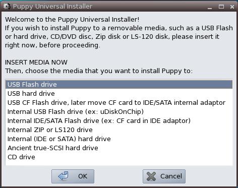 Puppy Linux includes a USB drive installer that's very easy to use, but it knows how to install only the version that is running. That's why you needed to make a CD of your distro earlier. Boot that CD and plug in a USB drive. Click on install on the desktop. Choose Universal Installer from the first page.