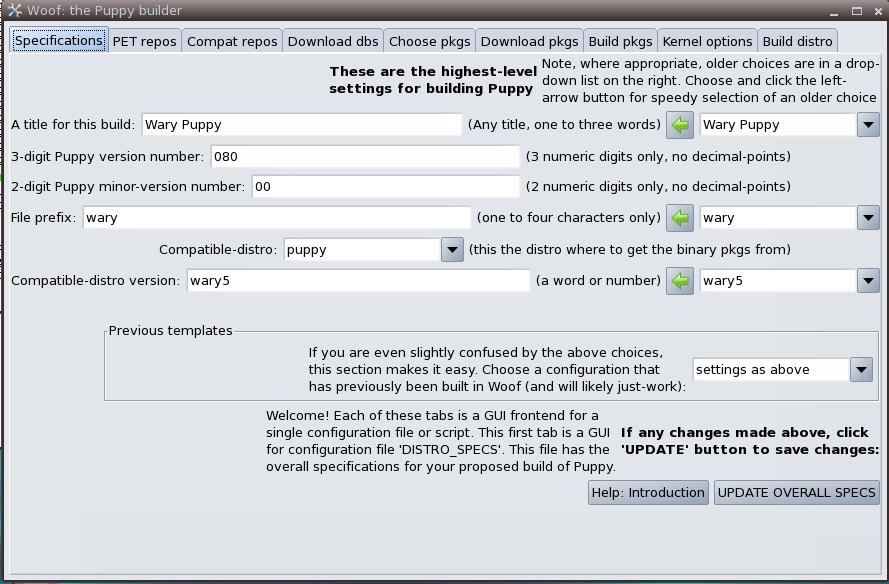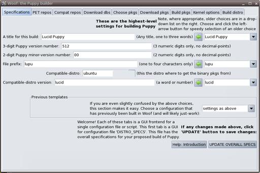 The Specifications tab shows the high-level settings for the distribution to be built. At the time of this writing, woof comes preconfigured to build Wary, one of the derivatives of Puppy Linux. Notice the “Previous templates” section about two-thirds of the way down. From this pull-down, you can select a number of previously defined (and proven) build templates, which minimizes the choices you have to make and the possibility of specifying something that won't work. I chose “Ubuntu Lucid Lynx LuPu”. If you make changes, select UPDATE OVERALL SPECS at the bottom to update the corresponding configuration files. You may get some errors about missing files—at this point, all of those should be configured for loading when Woof does the build.