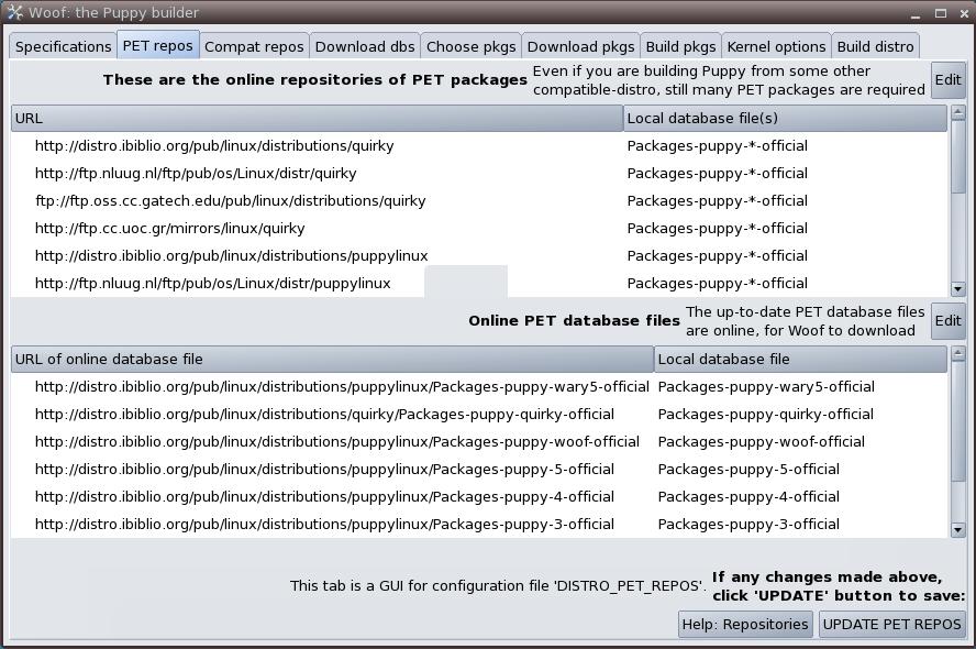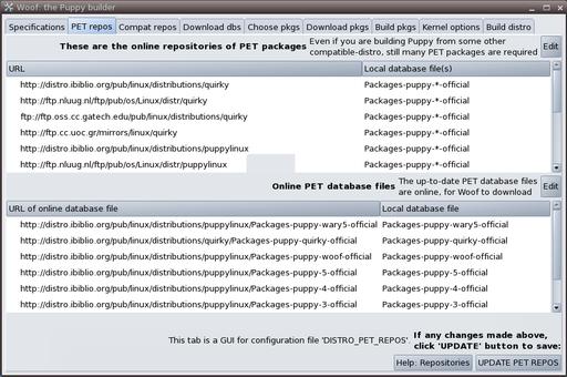 The next tab, PET repos, tells Woof where to find the PET packages and databases it needs for the build. PET is the native package format used by Puppy Linux and Woof. It is optimized so the packages are small and quickly loadable. Unless you want to add a PET package that isn't part of the standard Puppy PET repositories, you shouldn't have to change this tab. If you need to modify the list of repositories, click Edit, and you will be put into the text editor to edit the DISTRO_PET_REPOS configuration file. The Help: Repositories button will give you the format for the file. If you do make any changes, click UPDATE PET REPOS to save the updates.