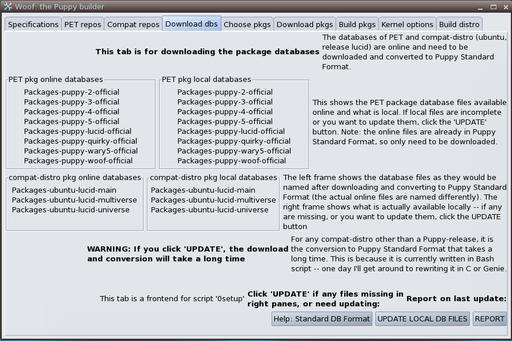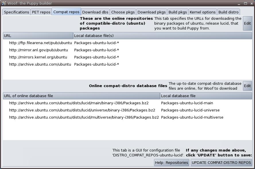 The next tab, Compat repos, gives Woof the on-line locations for packages and databases compatible with the entry “Compatible-distro”, that you made on the Specifications tab. If you need to modify the list of compatible package locations, click the appropriate Edit button, and you will be put into the editor to edit the DISTRO_COMPAT_REPOS configuration file. Again, the format is available with the Help button, and if you make changes, you need to click UPDATE COMPAT-DISTRO REPOS to save them.