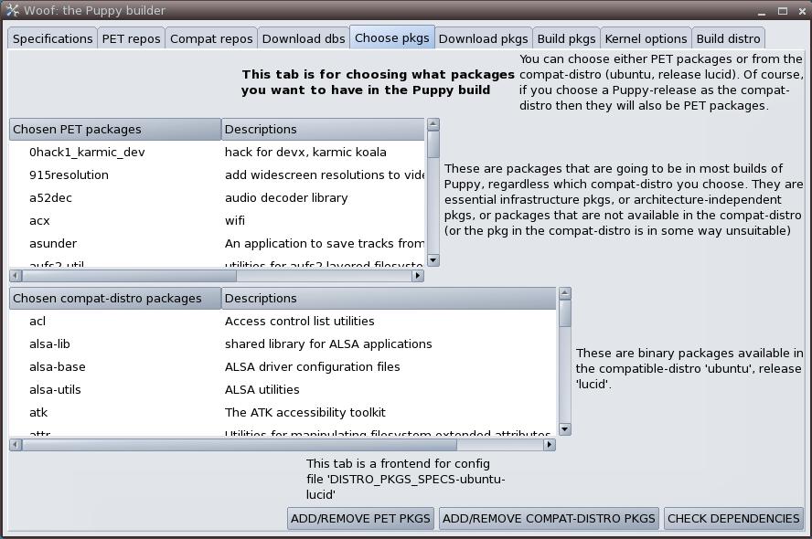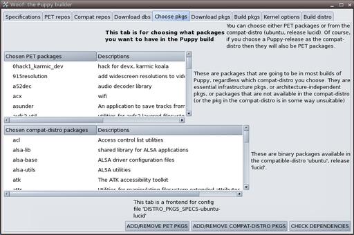 The next tab, Choose pkgs, is where you see the PET and compatible packages included in your build. There are separate buttons to edit the list of PET packages and the list of compatible distro packages, but at the time of this writing, these editors have not been implemented. No matter, you can change the package selection by directly editing DISTRO_PKGS_SPECS-<compatible distro>. The format of the file is given as a comment in the file itself. At the time of this writing, the CHECK DEPENDENCIES button also has not been implemented, so be sure the dependencies for any additions are included, so the build can complete successfully.