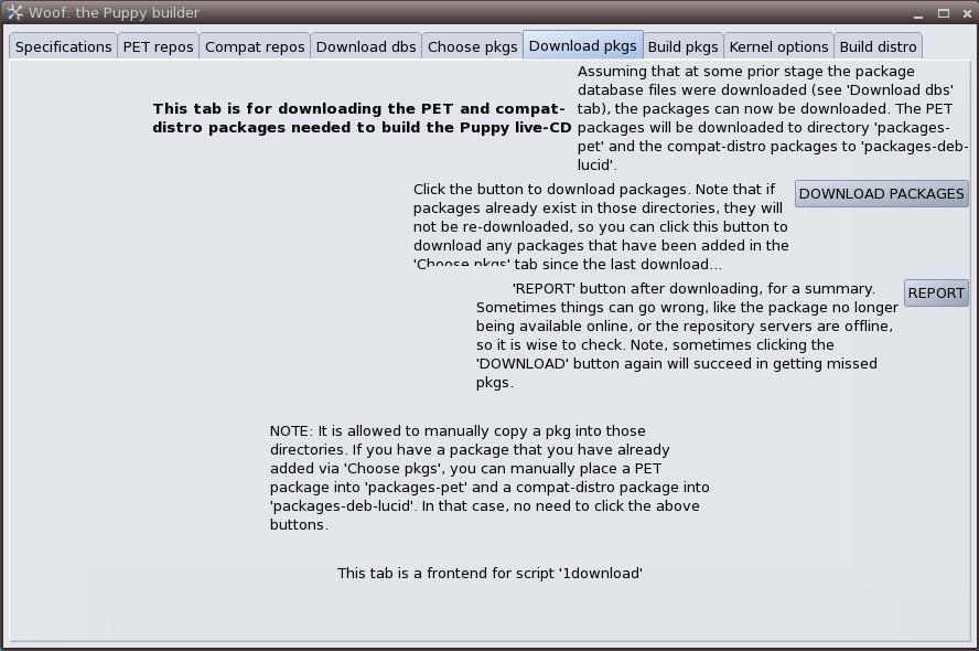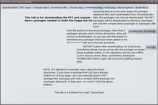 The Download pkgs tab executes the script (1download) that actually downloads the packages you specified for your distribution. Again, this takes a while. The script first checks to be sure the on-line package locations are reachable, then downloads each of the packages needed. Downloading can take several hours, so a small control panel dialog box pops up to let you pause, resume or quit the script. If a package already exists in the local location, it does not download again, so the script also can be used to restart a download or update the set of packages when a change is made. The REPORT feature on the tab is not yet implemented, but the results are in a file called DOWNLOAD-FAILS-PET or DOWNLOAD-FAILS-<distro> in the woof-tree directory.