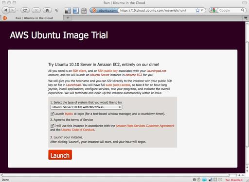 Last year, I wrote an article on how to run Ubuntu 9.10 in the Amazon Elastic Cloud (LJ, May 2010). But, the folks over at Canonical haven't been sitting on their laurels during the past year. They're so proud of the work they've done on their latest release, 10.10 Maverick Meerkat, they're offering a free 55-minute trial of it in Amazon's EC2 cloud. The best part is you don't need an Amazon EC2 account or a credit card. The wizards at Canonical have tied this in to their Launchpad software collaboration platform, so all you need is an account on launchpad.net to “get your cloud on”.