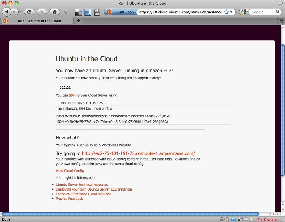 When the instance is ready for use, you'll see a countdown clock in your browser with the remaining time and the IP address of your instance. You can SSH in to your instance by logging in as “ubuntu@<ip address>”, or if you selected one of the preloaded software packages, like WordPress, the Web page will display a link you can use to get to the admin interface of your package.
