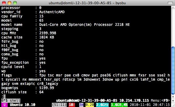 Figure 3. SSH'd to my new instance, with /proc/cpuinfo displayed. Note byobu at the top of the window.