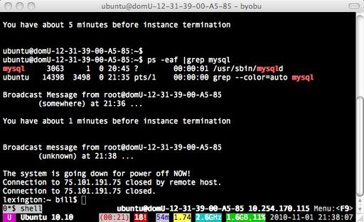 As your hour winds down, if you're SSH'd to the instance, you'll get a “wall” message ten minutes before your hour is up, another when there are five minutes remaining, and a final message at the one-minute mark. Once your time is up, the instance “powers off”, and the Amazon cloud automagically cleans up and deletes your instance, as well as any data you put there, so make sure you're not putting anything important there. It truly is a demo service.