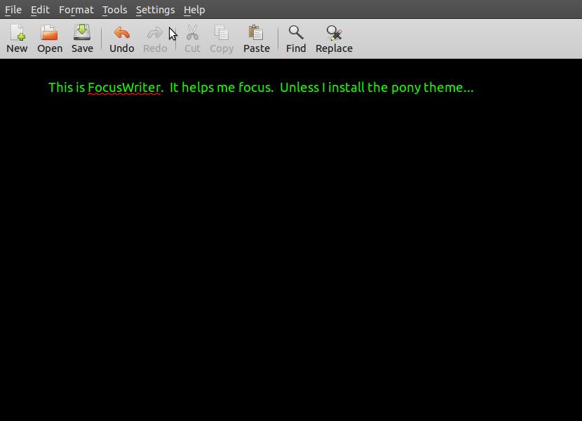 And really, that's it. They may seem like simple things, but it's difficult to find software that meets the bill. A few options are available, but by far, the most usable I've found is FocusWriter. It has all the features I want, and it's small and fast requiring very few libraries to install. My only complaint is there's no option for keeping the menu on the screen. In order to see the menu, you need to mouse-over the top of the window. Yes, I know it's a feature, but it's a feature I'd like to turn off. The flickering menu tends to distract me. You know, like a pony.