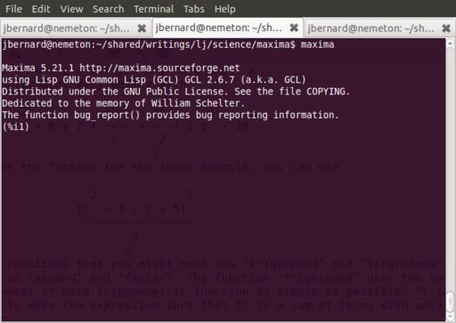 To start Maxima on the command line, type maxima. You should see some licensing information and then a prompt (Figure 1). To get a GUI, run wxmaxima (Figure 2).