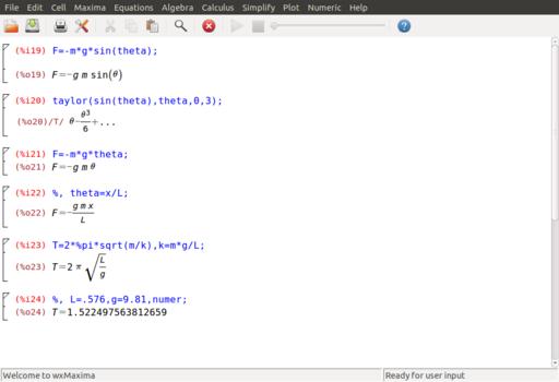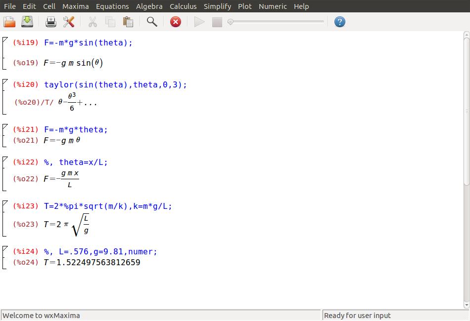 If the angle O is measured in radians, it's equal to x/L, where x is the actual amount of the arc that the pendulum bob travels along, and L is the length of the pendulum string. Once you do this, you've essentially minimized the nonlinear part to the point where you can treat the pendulum as a simple harmonic motion, with the force constant of (mg/L). If you plug this in to the equation for harmonic motion, you get the time for an oscillation given by 2*pi*sqrt(L/g). In a Maxima session, this would look like Figure 3. You can see that we get a result from theory that is really close to what we actually measured.