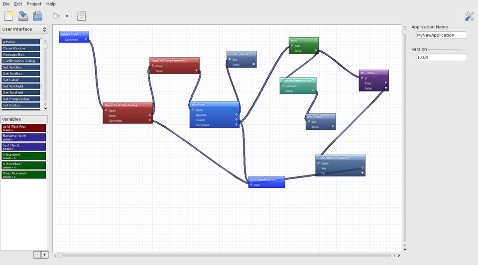 So far, I've been talking about code blocks in fairly generic terms. So what kinds of blocks do you have to work with? Of course, the most important block is the Window block. This block creates an application window in which you can put buttons, labels, form fields and text fields. This block essentially creates the “face” of your application. You can create as many windows as you need and open and close them according to your application's needs. You also can create message boxes and confirmation boxes. Additionally, there are blocks that allow you to get and set the value of the various window controls.