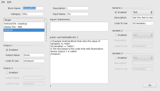 The right-hand section of the window describes up to three side effects that the block can have. Results of any calculations done in the code body can be sent to variables for use by the rest of the application. Which variables are modified is determined when you drag the resulting block onto the canvas and configure it. There doesn't seem to be any type of extensible API for modifying other variables.