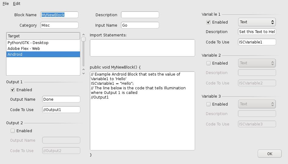 Continuing on, notice that you can define up to two “outputs” for your block. Custom blocks accept only one input, but you can define the name of that input. This actually makes some sense because the “input” isn't actually accepting any “input”. It's just a connection point. The rest of the center of the custom block definition window is where the meat is, and potentially, where the work is. This is where you write the code that actually implements the function you intend for the block. Keep in mind that you have to write code for each target architecture you intend to support, in that target's native language. As a hint as to what your code needs to look like, you are given example code for the currently selected target.