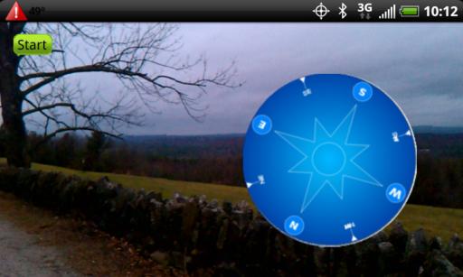 The user sees a Start button and a compass card superimposed on the current camera preview. The Start button isn't really needed, but I included it so I could show how JavaScript/HTML can call a Dalvik method.