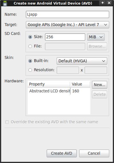 With the download(s) complete, let's create an Android Virtual Device (AVD). An AVD is a virtual version of an Android device that you can run on the emulator. Select the Virtual Devices tab, then click on the New button. A dialog appears that you can use to set the characteristics of your AVD. Figure 1 shows that I've given my AVD a name (LJapp), selected an API target (API Level 7, which is Android 2.1) and set my virtual SD card to 256 meg. When you have made your selections, click on the Create AVD button to initialize your AVD.