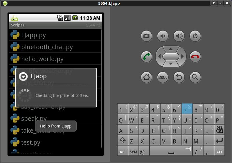Your Android emulator now is ready to run your custom Python script, so let's create one. Before you do though, note that the published SL4A API is a subset of the full Android API, so certain features either are not available, in the process of being made available or fully supported (see Resources for a link to the current list). Don't let this put you off. What's there is more than enough to produce usable Android apps in Python.