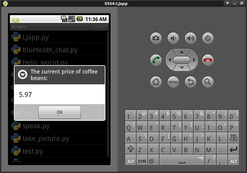 Go on, tap your app name, then tap the run wheel. After a moment, you should see the spinner dialog appear while your script contacts the Beans'R'Us Web site and requests the current price of coffee (Figure 5). Shortly thereafter, the current price appears in another dialog (Figure 6). Congratulations! The script has been ported to your Android virtual device.