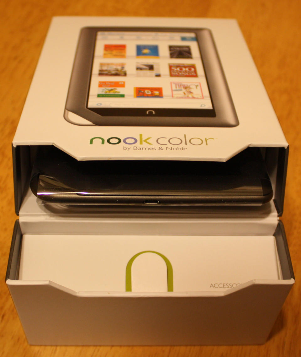 I've never covered an “unboxing” ritual before, but I feel compelled to mention it with the NOOKcolor. Your first impression of the NOOKcolor is when you open the box, and Barnes & Noble really did a great job on the packaging. It's a cardboard box that utilizes a magnetic closure to hold the lower one-third of the box closed. You pivot the lower one-third back, and it'll bend back and is held against the back of the box by another magnet, where you can reach inside the box and pull the NOOKcolor out of its recycled cardboard sarcophagus. It's wholly unnecessary, but absolutely awesome in its execution, and it gives you a clue as to what Barnes & Noble is thinking: the NOOKcolor is no device to be trifled with.