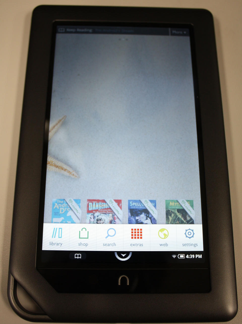 Page flipping on the NOOKcolor is a completely different experience from the original NOOK too, as the unit has no hardware page forward/reverse buttons. Instead, you use the touchscreen to swipe across the screen, like you are turning the pages of a book. Alternatively, tapping the right side of the screen advances the page, and tapping the left side of the screen flips a page back. Unfortunately, there is no “page-flipping” animation—the screen simply displays the next page. I'd like to see a page-flipping animation while using the swipe gesture and have the current behavior on screen taps, as the shorter gesture implies a faster page turn.
