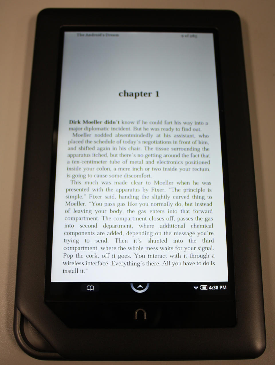 As good as a reading experience as I found the original NOOK, the NOOKcolor is better in almost every way. The instantaneous response of the IPS color touchscreen is a treat after the perceptible wait of the E Ink screen of the original NOOK. Although I found the original NOOK acceptable, not having the flash of the screen and the page flipping delay is quite nice. I'm fortunate in that I'm not prone to eye strain, so looking at the NOOKcolor's screen wasn't an issue for me, but if you're prone to that, you might want to test-drive a NOOKcolor at your local Barnes & Noble for a bit. The one place the color screen is a liability is in bright light or sunlight. It just can't compete with the E Ink screen of the original NOOK under those conditions. Personally, I prefer the vivid, backlit screen of the NOOKcolor. You can see it in Figure 4, with John Scalzi's excellent book The Android's Dream displayed (get it if you haven't already!). All the original NOOK features for highlighting, bookmarking and instant dictionary lookup are present and accounted for.
