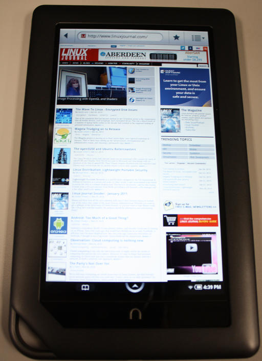 The march of technology never ends. Not long ago (in the December 2010 issue of Linux Journal, actually), I reviewed the Android-powered NOOK e-reader from Barnes & Noble. That product was an E Ink-based product, running Android 1.5. What a difference a few months can bring. Barnes & Noble has just released its second-generation e-reader, the NOOKcolor. As one can gather from the name, the NOOKcolor's immediate distinguishing factor is a 7" color touchscreen, while the original NOOK had a 6" black-and-white E Ink screen.