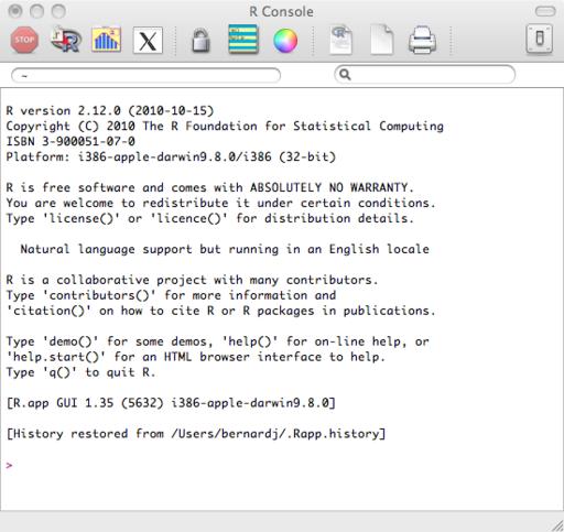 Graphical interfaces also are available for Windows and Mac OS X. Here, I'm looking at actual commands in R, so I'm using the text interface. To start it, simply type R and press Enter.