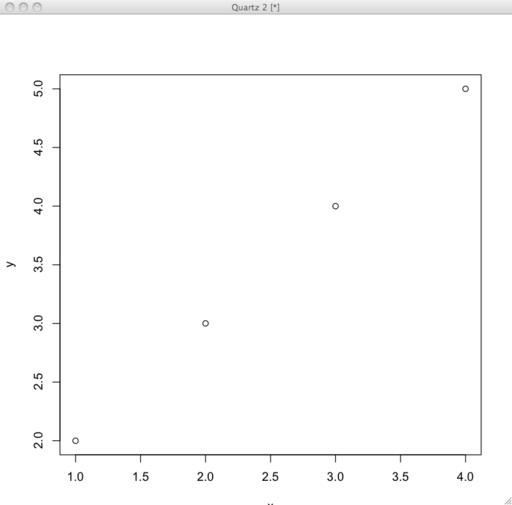 > x = c(1,2,3,4) > y = c(2,3,4,5) > plot(x,y)