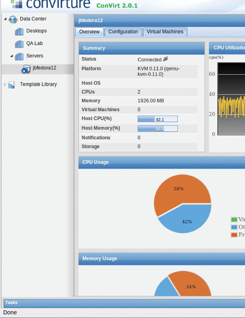 Also keep an eye on performance. Even with resource allocation in place, hosts can spike due to overpopulation or hardware failures. Most vendors' management GUIs have some form of performance monitoring. Open-source users can use virt-manager for KVM or Convirt to monitor performance on KVM and Xen systems (Figure 6). With reliable knowledge of your host utilization, you can plan future hosts better and improve your ability to consolidate, which in many cases, means improving ROI.