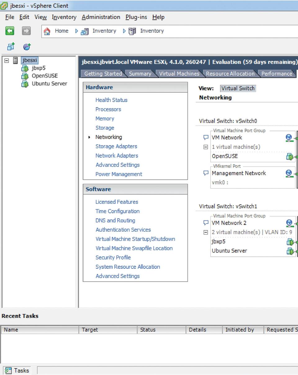 When it comes to networking guests, you have two basic options: bridging with NAT or using a virtual switch. Bridging is simple and quick to set up, but it is less secure and only masquerades the guest's virtual NIC as the host's NIC. Using a virtual switch gives you more flexibility in networking your guests. The default configuration on most solutions is to use a single default virtual switch for all guests that is uplinked to one of the host's NICs. Now, most solutions even have the ability to use VLANs on their virtual switch. The process of VLAN-ing involves labeling a client NIC with a unique ID so it communicates only with other computers that use the same VLAN ID. VLANs on a virtual switch can exist solely on the host or span other guests and devices on the physical network (Figure 7).