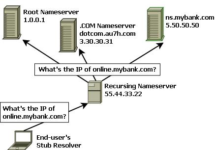 Finally, the recursing nameserver asks ns.mybank.com whether it knows the IP address for online.mybank.com. Yes, it does: ns.mybank.com replies with the requested IP address, and the recursing nameserver forwards that information back to the end user's stub resolver, which in turn provides the IP address to the end user's Web browser.