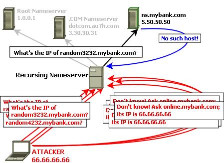 In the example here, however, the attacker instead is using the pretense of referring to a different nameserver, in order to plant a fake online.mybank.com Web server's IP address into the target recursing nameserver's cache. The fact that this fake Web server doesn't even respond to DNS queries doesn't matter; the attacker wants on-line banking traffic to go there.