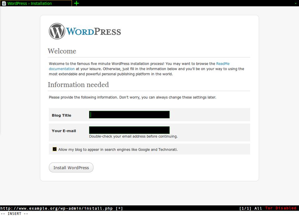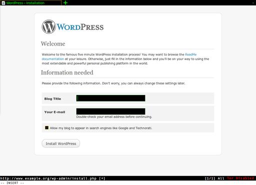 Like with many dynamic sites these days, WordPress gets its data from a database back end: in this case, MySQL. The wordpress package includes a nice little shell script you can use to set up your MySQL database automatically for your site at /usr/share/doc/wordpress/examples/setup-mysql. All you have to do is pass it the -n option and tell it the name of the MySQL user you want to use and the name of the database. In my case, I use the user name “wordpress” and name the database after my site, www.example.org: