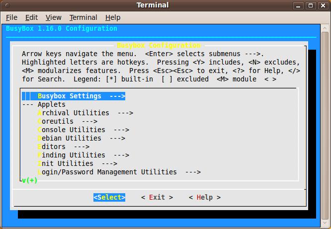 Note that the last one will work only after you enable the Linux kernel option in the main Buildroot configuration menu. Chances are that you already know how to configure the kernel, and uClibc configuration rarely requires tweaking, unless you want to compile out some functionality in order to save memory, so I'm going to look at BusyBox configuration only.