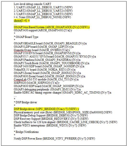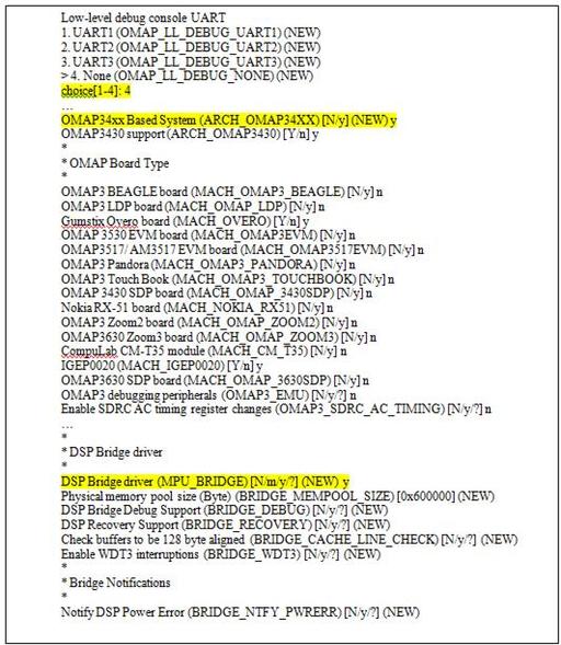 Next, issue the make oldconfig command, which is used to update the current .config file with new options. Generally, the default responses to the questions are acceptable, except in the highlighted cases shown in Figure 1.