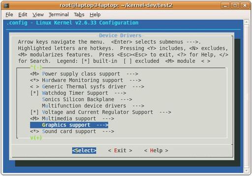 Note that the ellipses in Figure 1 are used to indicate breaks in the output for display purposes. Now, issue the make menuconfig command, which will launch a configuration interface in the terminal, such as the one shown in Figure 2.
